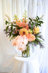 Peach gerberas, cream grande roses, pink hypericum, banksia, pink phalanopsis orchid, Ink berry, koala fern.